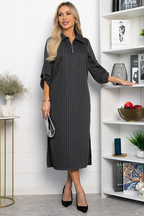 Платье прямого кроя в оттенке графит станет идеальным выбором для повседневных рабочих дней и официальных мероприятий. Удобные боковые разрезы придают образу динамичность и легкость. Рукава длиной три четверти изящно завершаются патой с пуговицей, добавляя изделию утонченности. Отложной воротник создает классический и элегантный вид. Это платье станет отличным выбором для тех, кто ценит комфорт и стиль в деловой обстановке.