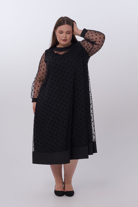 Оригинальное двойное платье А - образного силуэта. Верхний слой платья выполнен из мягкой сетки флок «горох». Круглый вырез горловины оформлен притачной обтачкой и дополнен по центру спинки застежкой на петлю и пуговицу. Рукава втачные длинные, по низу дополнены трикотажной манжетой. Широкая притачная вставка по низу и обтачка горловины в качестве отделки выполнены из ткани компаньона. Нижний слой платья выполнен из плательной ткани в тон верха. Горловина оформлена окантовкой. Слои скреплены между собой в области проймы.  Модель прекрасно подойдет обладательницам любых форм и поможет создать интересный вечерний образ.