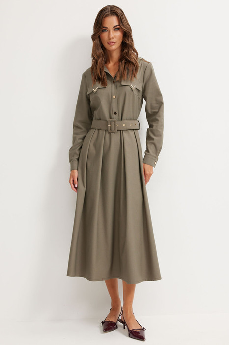 Платье прямого силуэта расширенное к низу из плательной ткани. Воротник рубашечного типа с застежкой по центру на петли и пуговицы. Платье отрезное по линии талии. От подреза на талии вниз заложены декоративные складки. В боковых швах карманы. По переду на лифе нагрудные вытачки и декоративные клапаны. В комплект входит пояс из основной ткани. Обращаем ваше внимание, что фурнитура может отличаться от фото.
