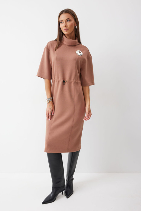 Платье прямого силуэта из трикотажного полотна. Горловина-стойка. Рукав со спущенной линией плеча, с коротким рукавом. На спинке в центральном шве по низу разрез. По переду и спинке декоративные рельефы. В районе талии кулиса с фиксатором для регулирования степени прилегания. В комплект входит съемная брошь. Обращаем ваше внимание, что фурнитура может отличаться от фото.