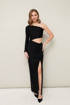 Стильное платье свободного кроя со слегка завышенной фигурной линией талии по переду. Рукав втачной, длиной ниже локтя. По спинке застежка на потайную молнию. Платье дополнено функциональными боковыми карманами.  Длина платья от плечевого шва 126 см. Длина рукава 38см.