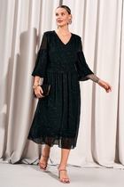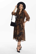 Легкое воздушное платье приталенного кроя с расширенной книзу юбкой. То талии платье отрезное, присборено на эластичную тесьму. Дополнено съемным поясом , выполненным из основной ткани. Рукав втачной, 3/4, по низу присборен на эластичную тесьму. Горловина с V-образным вырезом. Спереди платье дополнено разрезом. Длина платья от плечевого шва 127см. Длина рукава 47см.