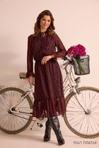 Платье в стиле оверсайз. Горловина округлой формы, слегка расширена. Платье с подрезом ниже линии бедер, нижняя часть со сборкой по кругу. Перед с нагрудными вытачками от боковых швов и вышивкой от подреза. В боковых швах карманы. Верхняя часть спинки со средним швом, вверху которого разрез, застегивающийся на 2 навесные петли и пуговицы. Рукав втачной одношовный, длиной 3/4