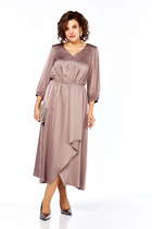 Платье полуприлегающего силуэта слегка зауженное к низу со смещенной застежкой на пуговицы и V-образным вырезом. Объемные карманы накладные с клапаном. Рукав втачной одношовный короткий. По низу платья, низу рукава и по поясу декоративные строчки. В комплекте пояс из основной ткани с застежкой на пряжку.