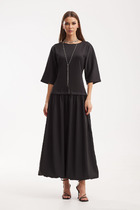 Платье А-силуэта с завышенной талией. Горловина округлой формы. Рукав расширенный к низу, на резинке. Спинка со средним швом с застежкой на воздушную петлю и пуговицу. Юбка состоит из двух объемных присборенных воланов.