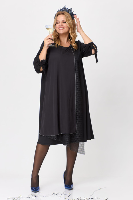 Нарядное платье из водолаза идеально подойдёт для любых торжеств. Изделие имеет трапециевидный силуэт. Платье длиной ниже колена с втачным рукавом 3/4 на притачной манжете с завязкой. По переду изделия две отлетные детали, которые украшают платье и делают его неповторимым (верхняя деталь из шифона с отделкой серебряной нитью, нижняя — сетка с серебром). Платье подчеркнет Ваши достоинства и не будет сковывать движения, прекрасно дополняется различными аксессуарами.
