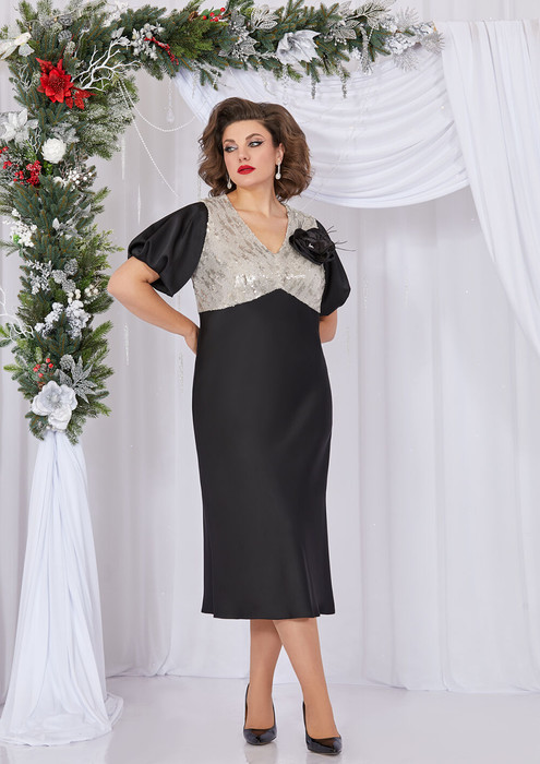 Стильное женское платье полу-прилегающего силуэта, выполнено из плотного атласа и ткани с пайетками. Лиф платья из пайеток, на подкладке, отрезной ниже линии груди, с V-образным вырезом. Юбка платья расклешенного силуэта, покроена по диагонали нити основы ткани, что дает эффект струящегося низа и добавляет эластичности ткани. Спинка идентична полочке, с отрезным лифом из пайеток, юбка из атласа. Рукав втачной, из атласа, со складками по окату и по низу, на подкладке из атласа. Стильное платье отвечает последним трендам моды, отлично подойдет для торжества.