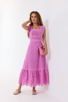 Элегантное женское платье полу-прилегающего силуэта, выполнено из плиссированной ткани, на трикотажной подкладке. Горловина платья V-образной формы, с притачной планкой по одной стороне, декорированной стразами.  По линии талии отрезное, с присборенной кокеткой из основной ткани. Юбка платья расклешенного силуэта, присборена по линии талии, с одной стороны обработан вертикальный подрез, по низу разрез, сверху планка декорированная стразами. Спинка из плиссированной ткани, отрезная по линии талии, в шов вставлена резинка для более хорошего прилегания. Рукав втачной, укороченный, расклешенный к низу. Эффектное платье из изящной ткани прекрасно дополнит ваш образ и подчеркнет достоинства фигуры!