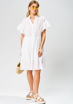 Элегантное женское платье полу-прилегающего силуэта, выполнено из плиссированной ткани, на трикотажной подкладке. Горловина платья V-образной формы, с притачной планкой по одной стороне, декорированной стразами. По линии талии отрезное, с присборенной кокеткой из основной ткани. Юбка платья расклешенного силуэта, присборена по линии талии, с одной стороны обработан вертикальный подрез, по низу разрез, сверху планка декорированная стразами. Спинка из плиссированной ткани, отрезная по линии талии, в шов вставлена резинка для более хорошего прилегания. Рукав втачной, укороченный, расклешенный к низу. Эффектное платье из изящной ткани прекрасно дополнит ваш образ и подчеркнет достоинства фигуры!