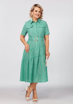 Стильное платье полу-прилегающего силуэта, выполнено из летней ткани с эффектом «тай-дай». Горловина платья обработана воротником, застежка по переду на планку с пуговицами. На полочке обработаны кокетки и рельефы с двойной отстрочкой, также в шов кокетки вставлены клапаны. Юбка платья имеет ассиметричный подрез ниже линии талии, состоит из двух, присбореных воланов. Спинка идентична полочке, с кокеткой, рельефами, по линии талии настрочены шлевки и в комплект входит съемный пояс из основной ткани, с пряжкой. Рукав втачной, укороченный, на спинке выполнена объемная аппликация. Стильное платье для ценителей комфорта в сочетании с оригинальным кроем!