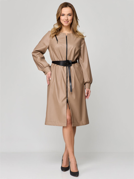 Платье из ЭКО-кожи на хлопковой основе. По переду застежка молния и декоративная молния выходящая из плеча. В боковых швах карманы. Рукав втачной одношовный со сборкой и манжетой по низу. Манжета застегивается на метлю и пуговацу. Длина платья 104 см, длина рукава 60 см.