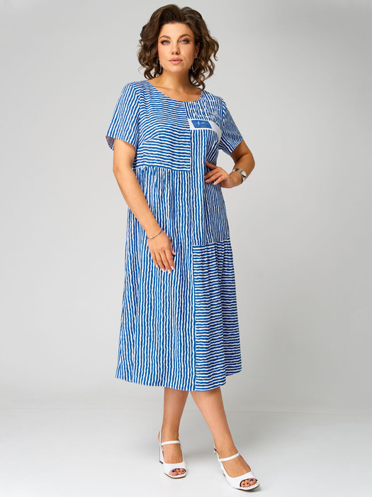 Платье свободного покроя с асимметричными горизонтальными подрезами и кокеткой. Кокетка декорирована печатью и нашивным элементом. Спинка с кокеткой. Рукав втачной одношовный короткий. Длина платья 115 см, длина рукава 22 см. Декоративная нашивка может отлечаться от фото.