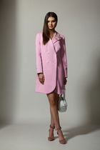 Платье женское полуприлегающего силуэта выполнено из плательной ткани. Горловина круглая. Спинка с застёжкой потайная тесьма молния в центральном шве, который заканчивается шлицей с разрезом. Рукава «летучая мышь», по низу встречные складки и манжет на застёжке две прорезные петли и пуговицы. Платье без подкладки. Дополнением служит пояс с декоративной пряжкой. Брошь в комплект не входит.