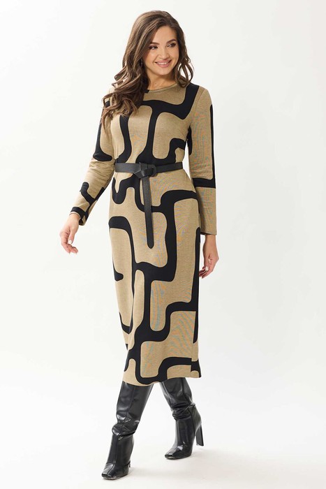 Платье полуприлегающего силуэта. Перед с нагрудными вытачками. Спинка со средним швом, заканчивающимся шлицей. Рукава втачные одношовные. Горловина обработана бейкой из основной ткани. Дополняет модель пояс.