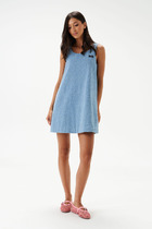 Платье женское полуприлегающего силуэта выполнено из плательной ткани. По переду нагрудные и талевые вытачки, застёжка на пять прорезных петель и пуговиц и прорезные карманы с клапанами. Спинка со средним швом и талевыми вытачками. Рукава двух шовные втачные. Воротник отложной. Дополнением изделия служит пояс с пряжкой. Длина изделия: 103 см. Длина рукава: 53 см.