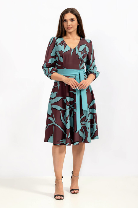 Платье женское полуприлегающего силуэта отрезное по линии талии. Лиф переда с нагрудными и талевыми вытачками. Горловина V-образная. По среднему шву спинки сверху застёжка потайная молния. Юбка расклешённая. Рукав одношовный втачной, по окату небольшая сборка. Низ рукава со сборкой на тонкие манжеты. Изделие дополняет пояс кушак. Платье без подкладки.