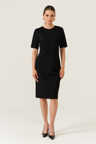 Платье женское полуприлегающего силуэта, выполненное из двух видов ткани: мягкого трикотажного полотна с принтом «Зебра» и плательной ткани «Замша», которые немного тянутся. По переду и спинке отрезной бочок, накладной карман. По боковым швам низ платья со шлицами и отделочными пуговицами. По спинке средний шов. Горловина переда – «Лодочка», по спинке – округлая, переходящая в линию кокетки. Срезы горловины обработаны отделочными кантами. Рукава втачные, одношовные. Платье без подкладки.