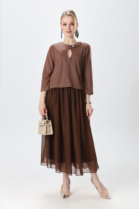 Платье миди комбинированное, двухцветное. Лиф с имитацией фигурной застёжки по горловине с декоративными пуговицами, фигурный по низу. Вырез горловины полукруглый, по спинке затежка на молнию. Рукава втачные. Юбка на резинке, драпирующаяся, расширенного силуэта из шифона. На подкладке.