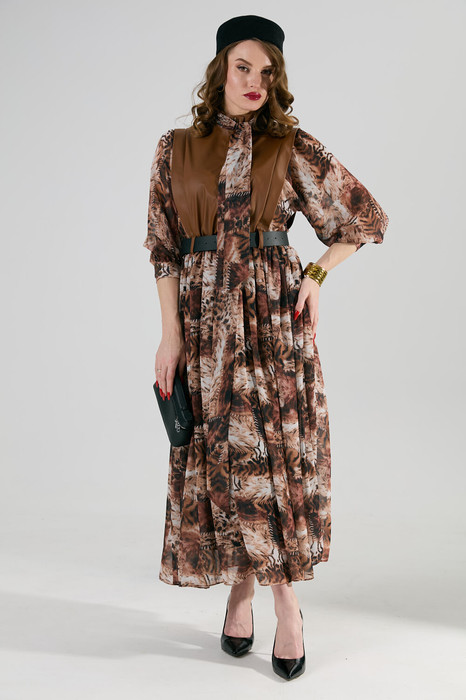 Платье комбинированное длиной макси, отрезное по линии талии с цельнокроеными рукавами. Застежка центральная с цельнокроеными планками на петли и пуговицы. Верхние части переда и спинки с вертикальными рельефами, начинающимися от линии плеча. Бантовая складка расположена по центру, боковые складки направлены от центра изделия в сторону бокового шва. Рукав цельнокроеный с боковыми частями переда и спинки с углубленной до линии талии проймой. По центру оката рукава сборка. Нижний срез рукава обработан притачной манжетой. Застежка манжеты на петли и пуговицы. Платье по линии талии собрано на резинку. Горловина изделия круглой формы, обработана воротником-стойкой, с застежкой на петли и пуговицы. Платье дополнено съёмным бантом. Бант съёмный, продевается в шлевки, расположенные на воротнике-стойке. В комплект к изделию идёт ремень из экокожи.