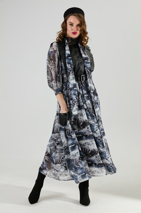 Платье комбинированное длиной макси, отрезное по линии талии с цельнокроеными рукавами. Застежка центральная с цельнокроеными планками на петли и пуговицы. Верхние части переда и спинки с вертикальными рельефами, начинающимися от линии плеча. Бантовая складка расположена по центру, боковые складки направлены от центра изделия в сторону бокового шва. Рукав цельнокроеный с боковыми частями переда и спинки с углубленной до линии талии проймой. По центру оката рукава сборка. Нижний срез рукава обработан притачной манжетой. Застежка манжеты на петли и пуговицы. Платье по линии талии собрано на резинку. Горловина изделия круглой формы, обработана воротником-стойкой, с застежкой на петли и пуговицы. Платье дополнено съёмным бантом. Бант съёмный, продевается в шлевки, расположенные на воротнике-стойке. В комплект к изделию идёт ремень из экокожи.