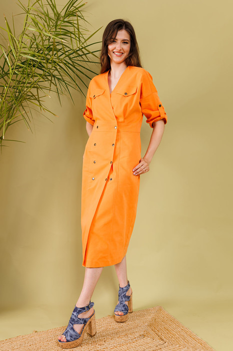 Эффектное двубортное платье длиной миди из облегчённого денима полуприлегающего силуэта. Линия плеча приспущена, рукав втачной три четверти с манжетой и патой. Горловина обработана обтачкой с  V-образным вырезом. Линия талии акцентирована притачным поясом. Имеются карманы в боковых швах. Изделие застёгивается на кнопки. Без подкладки.