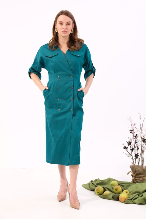Эффектное двубортное платье длиной миди из денима полуприлегающего силуэта. Линия плеча приспущена, рукав втачной три четверти с манжетой и патой. Горловина обработана обтачкой с V-образным вырезом. Линия талии акцентирована притачным поясом. Имеются карманы в боковых швах. Изделие застёгивается на кнопки. Без подкладки.