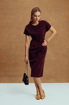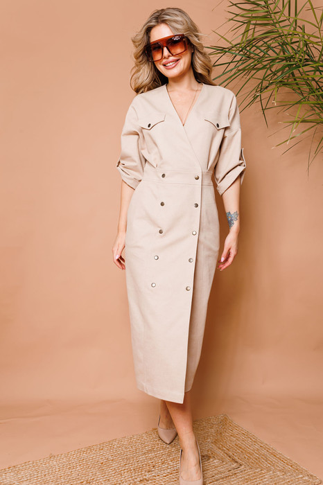 Эффектное двубортное платье длиной миди из облегчённого денима полуприлегающего силуэта. Линия плеча приспущена, рукав втачной три четверти с манжетой и патой. Горловина обработана обтачкой с V-образным вырезом. Линия талии акцентирована притачным поясом. Имеются карманы в боковых швах. Изделие застёгивается на кнопки. Без подкладки.