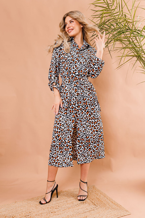 Изящное платье - рубашка прямого кроя из вискозного полотна с акцентным принтом. Горловина обработана рубашечным воротником с отрезной стойкой. Модель со слегка приспущенной линией плеча и длинным рукавом с манжетами. Длину рукава можно регулировать с помощью пат. Застёжка центральная на петли и пуговицы. По боковым швам расположены карманы. По низу изделия разрезы. В комплект входит пояс из основной ткани.