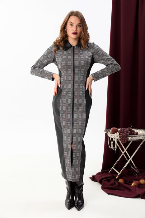 Утончённое комбинированное платье прилегающего силуэта длиной макси. На деталях полочек фигурные рельефы. Застежка платья на разъемную молнию в среднем шве полочки. На спинке средний шов и фигурные рельефы.Рукав реглан длинный и двухшовный. Вырез горловины округлой формы, оформленный отложным воротником.
