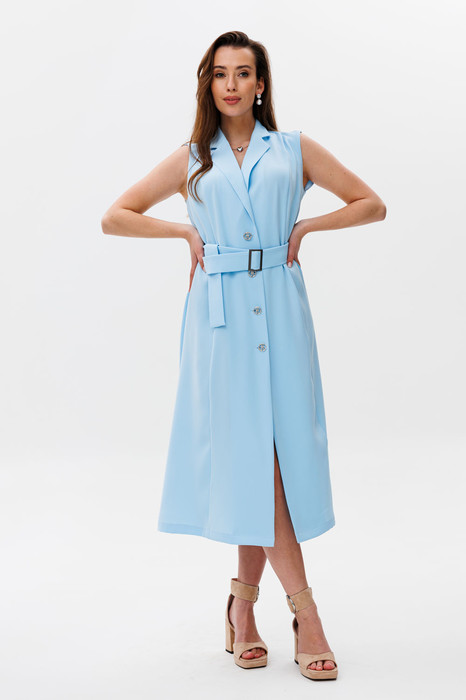 Многофункциональное платье-жилет  макси полуприлегающей силуэтной формы без рукавов. Полочка со смещённым бортовым краем назапах, с рельефными швами от линии плеча до низа. Застежка на петли и пуговицы. Спинка со средним швом и талиевыми вытачками. Воротник отложной с отрезной стойкой. В комплект входит пояс из основной ткани с отделочной пряжкой. Идеально комплектуется с брюками в качестве удлиненного жилета.