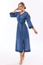 Эффектное двубортное платье длиной миди полуприлегающего силуэта. Линия плеча приспущена, рукав втачной три четверти. Горловина обработана обтачкой с  V-образным вырезом. Линия талии акцентирована притачным поясом. Имеются карманы в боковых швах. Изделие застёгивается на пуговицы. Без подкладки.