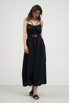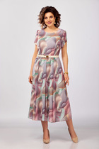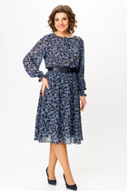 Воздумное платье трапециевидного силуэта отрезное ниже линии талии. Застежка центральная с отрезными планками на петли и пуговицы. Перед и спинка с притачными кокетками. Верхние срезы переда и спинки по линии соединены с кокеткой и собраны на сборку. Рукав втачной, одношовный. Нижний срез рукава со сборкой и разрезом, обработан притачной манжетой. Разрез рукава обработан обтачкой.