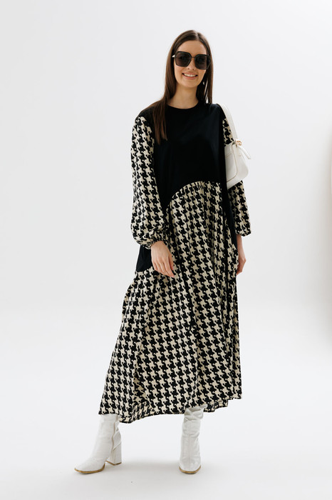 Оригинальное платье макси комбинированное. Лиф прямого кроя, имеет округлый вырез горловины, по линии талии собирается на кулису. По спинке застёжка на потайную молнию. В боковых швах карманы. Рукава-фонарики собраны на резинку. Юбка трапецивидной формы сводного кроя.