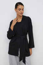 Платье макси комбинированное, двухцветное. Лиф выполнен из трикотажной ткани, от низа переда заложена складка, проходящая через плечевой шов до низа спинки. По линии талии с двух сторон настрочены кулисы с двух сторон со шнурком. Вырез горловины полукруглый. Рукава втачные, собраны на резинку. Юбка на резинке, драпирующаяся, расширенного силуэта.
