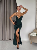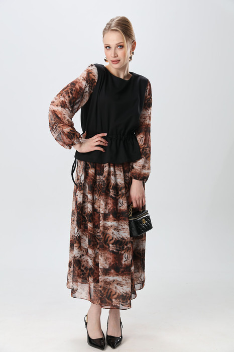 Платье макси комбинированное, двухцветное. Лиф выполнен из трикотажной ткани, от низа переда заложена складка, проходящая через плечевой шов до низа спинки. По линии талии с двух сторон настрочены кулисы с двух сторон со шнурком. Вырез горловины полукруглый. Рукава втачные, собраны на резинку. Юбка на резинке, драпирующаяся, расширенного силуэта.