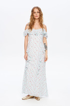 Платье состоит из двух платьев: нижнего и верхнего. Верхнее платье макси прямого свободного силуэта с воланом по низу изделия. Рукав втачной с притачным манжетом. Горловина обработана плосколежащим воротником из отделочной ткани фигурной формы. Центральная застёжка на петли и пуговицы. Нижнее платье комбинация на регулируемых бретелях.