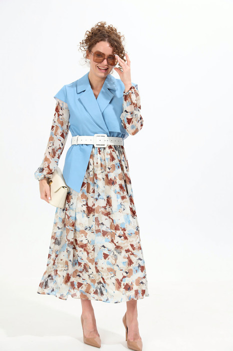 Платье комбинированное, состоящее из основной ткани и отделочной. Имитация верхнего жилета из денима прямого силуэта с воротником пиджачного типа. По правой пройме переда расположена фигурная  деталь  "крылышко". Спинка со средним швом. По низу правого переда и низу правой спинки фигурная деталь. По левой части переда и левой части спинки отлетная кокетка. Рукава одношовные, втачные, длинные со сборкой по линии низа на резинку из отделочной ткани. Юбка прямого силуэта длинная, со сборкой по талии из отделочной ткани. По линии талии платья резинка и шлевки по боковым швам и центральному шву спинки из основной ткани. В комплект к платью идёт ремень с пряжкой.