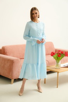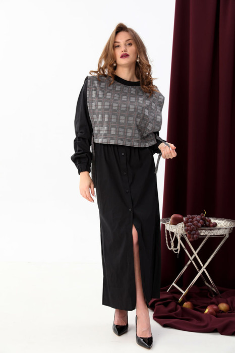 Комплект двухпредметный: состоит из платья-рубашки и манишки. Платье прямого кроя с центральной застёжкой на петли и пуговицы. По линии талии венгерка. Вырез горловины глубокий округлый. Линия плеча приспущена. На рукавах изделия заложены декоративные защипы, по низу - широкая резинка. Рукава - фонарики. Манишка может носиться как отдельно, так и в комплекте с платьем. Вырез горловины округлый. Перед и спинка фиксируются с помощью декоративных полуколец.