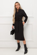 Платье макси с центральной отрезной застёжкой на центральную застежку на петли и пуговицы.По переду и спинке цельнокроеные складки на уровне талии. Рукав втачной,одношовный рубашечного типа. По низу рукава пробиты петли и вставлена завязка для фиксации сборки . Воротник рубашечный стояче отложной. В комплект идёт пояс из основной ткани.