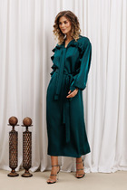 Платье макси с центральной отрезной застёжкой на потайную планку на петли и пуговицы.По переду и спинке цельнокроеные складки на уровне талии. Рукав втачной,одношовный рубашечноно типа. По низу рукава пробиты петли и вставлена завязка для фиксации сборки . Воротник рубашечный стояче отложной. В комплект к изделию идёт пояс из основной ткани для максимально комфортного регулирования объёма.
