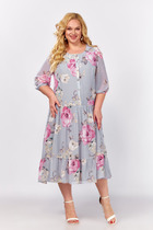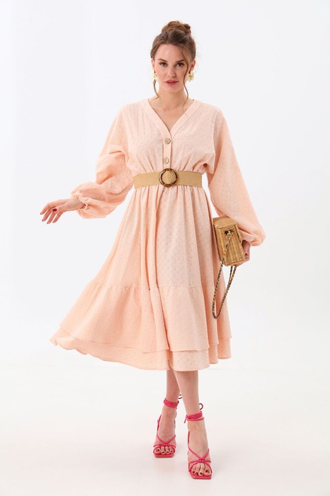 Платье полуприлегающего силуэта, отрезное по линии талии. Горловина V-образной формы, обработана притачной обтачкой. На планке застёжка на петли и пуговицы. Талия собрана на резинку. Рукав цельнокроеный широкий, низ рукава собран на резинку. Юбка платья имеет два волана разной длины, воланы собраны на сборку. В комплект к изделию идёт плетёный ремень.