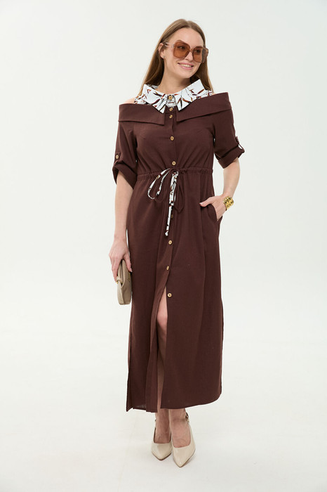 Эксклюзивное платье длиной макси полуприлегающего силуэта. Отрезное по линии талии, на кулисе. Полочка с центральной застежкой на петли и пуговицы, край борта обработан притачной планкой. Вырез горловины обработан отложным воротником со стойкой и имитацией рубашечного воротника из контрастой по цвету отделочной ткани. Рукав втачной на манжете с патой.