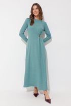 Комплект состоит из двух платьев: верхнего и нижнего. Платье верхнее свободного объёма, расклешенное к низу, с цельнокроеным рукавом, длиной макси. По переду и спинке, на линии талии настрочена кулиска для регулировки объема и формирования сборки с помощью шнура. Рукав цельнокроеный короткий с углубленной проймой. Плечевой шов дополнен кулиской для формирования сборки с помощью шнура. Шнур выведен наружу со стороны низа рукава. Вырез горловины имеет круглую форму, обработан обтачкой. Нижнее платье комбинация на регулируемых бретелях.