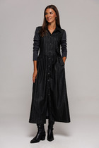 Платье длиной миди комбинированное, свободного кроя, расклешенное к низу. Перед состоит из центральной и боковой части. Спинка с притачной кокеткой, центральной и боковыми частями. На переде и спинке по линии талии настрочена кулиска, с регулировкой прилегания с помощью шнура. Рукав втачно одношовный короткий. Горловина изделия круглой формы.