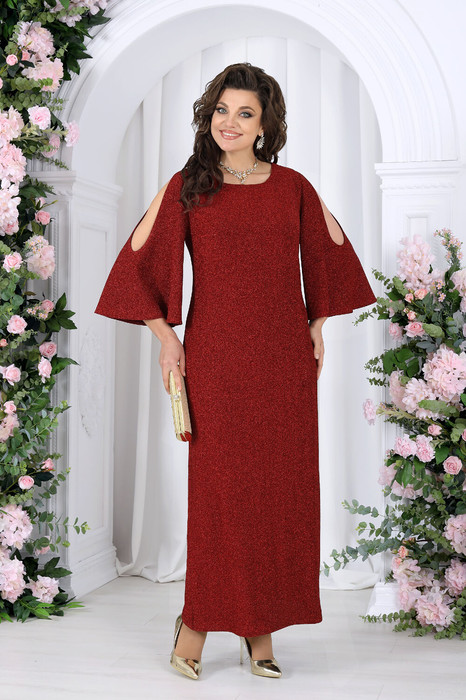 Платье женское полуприлегающего силуэта, выполнено из трикотажного полотна с фактурной лицевой стороной «люрекс». Модель на трикотажной подкладке, без застежки и плечевых накладок. Перед платья с нагрудными вытачками, направленными от проймы. Спинка с талиевыми вытачками и разрезом в нижней части среднего шва. Края V-образной горловины спинки фиксируются тремя перемычками из основного материала; горловина переда круглой формы. Рукав трехчетвертной, расширенный, с вырезом «капля» от плеча. Длина платья -- 144 см; длина рукава - 49 см.