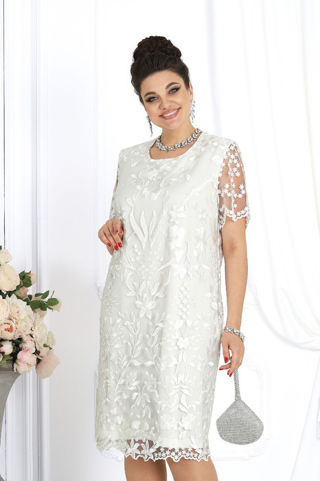 Платье женское, полуприлегающего силуэта, выполнено из гипюра и плательной ткани «сатин». Перед и спинка состоят из двух разных по длине слоев: нижний короче верхнего на 5 см. Модель без подкладки, с плечевыми накладками. Низ платья и рукавов оформлен фестонами. Перед в верхнем и нижнем слоях с нагрудными вытачками, выходящими из пройм. Спинка с талиевыми вытачками и средним швом, в верхней части которого обработана застежка на потайную тесьму-«молнию» (50см), в нижней – разрез. Вырез горловины переда и спинки округлый, углубленный по переду. Рукав короткий, втачной. Верхний и нижний слои платья скреплены по среднему шву, плечевым и проймам. Длина платья (верхний слой)-108 см, длина рукава-26 см.