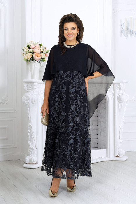 Платье женское, выполнено из гипюра и плательной ткани «сатин». Перед и спинка состоят из двух разных по длине слоев: нижний короче верхнего на 10 см. Модель без подкладки, без рукавов и плечевых накладок, без воротника. Платье отрезное по линии талии, с лифом прилегающего силуэта и расширенной к низу юбкой. Верхний и нижний слои материалов лифа скреплены по горловине, проймам, плечевым и рельефным швам переда и спинки. Верхний и нижний слои юбки скреплены только по лини талии; на переднем и заднем полотнищах верхней юбки обработаны рельефные швы. В среднем шве спинки предусмотрена застежка на потайную тесьму-«молнию» (50см). Вырез горловины переда и спинки округлый, углубленный по переду. Платье дополняется пелериной из шифона, разъемной по середине спинки; низ пелерины асимметричный, укороченный спереди. Пелерина пристегивается по горловине платья на 2 навесные петельки и 2 маленькие пуговицы. Длина платья (верхний слой) - 133 см. Длина пелерины – 128 см.