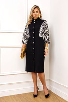 Платье женское полуприлегающего силуэта, по форме «песочные часы». Платье втачного покроя, на подкладке. По переду расположены прорезные карманы в рамку с клапаном в шве притачивания боковой части. На спинке расположены талиевые вытачки и средний шов с «тесьмой-молнией». Платье к низу слегка расширено, длина «макси». Горловина округлой формы. Рукав одношовный с разрезом до локтя. Платье длины мини.