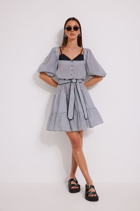 Платье женское, короткое, расширенное к низу, с двумя воланами. Платье на бретелях, по переду с имитацией белья из отделочной ткани. В чашечки вставлена отделочная тесьма. По центру переда шов с навесными петлями и отделочными пуговицами. По центу спинки, для хорошего приталивания, вставлена резинка. Рукав широкий, сверху на широкой резинке, снизу на узкой. Рукав можно спустить с плеча или наоборот надеть на плечо.