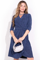 Платье-рубашка с отделкой из ткани с блеском, полуприлегающего силуэта, с потайной застежкой на петли и пуговицы и воротником рубашечного типа. На планке две декоративные пуговицы. На полочке нагрудные вытачки, слева накладной карман из отделочной ткани. По бокам вставки из отделочной ткани и боковые карманы. Рукав втачной, присобран на пришивную пату. Спинка удлинена.